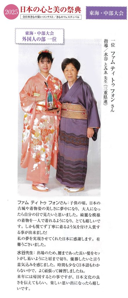 ![]() 2024年11月17日日、三県総合文化会館で開催された「2025全日本着物装いコンテスト」の東海・中部大会にて 弊社の ファム ティ トゥイ フォンさんが出場し、見事外国人の部で優勝しました。 | ![]() | ![]() |